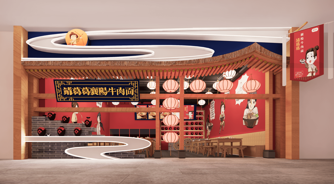 最后,一个品牌的发展与破圈,必定离不开当前消费市场上存在的热门元素。如今,国潮盛行,中国消费文化自信大大提升,对传统餐饮品牌的热情正是推动“靖葛葛襄阳牛肉面”快步前进的东风。例如,“靖葛葛”采用的武侠风标准装修风格就有着其特殊性,更容易吸引更多年轻人打卡、消费、发圈、点赞,最终实现破圈。