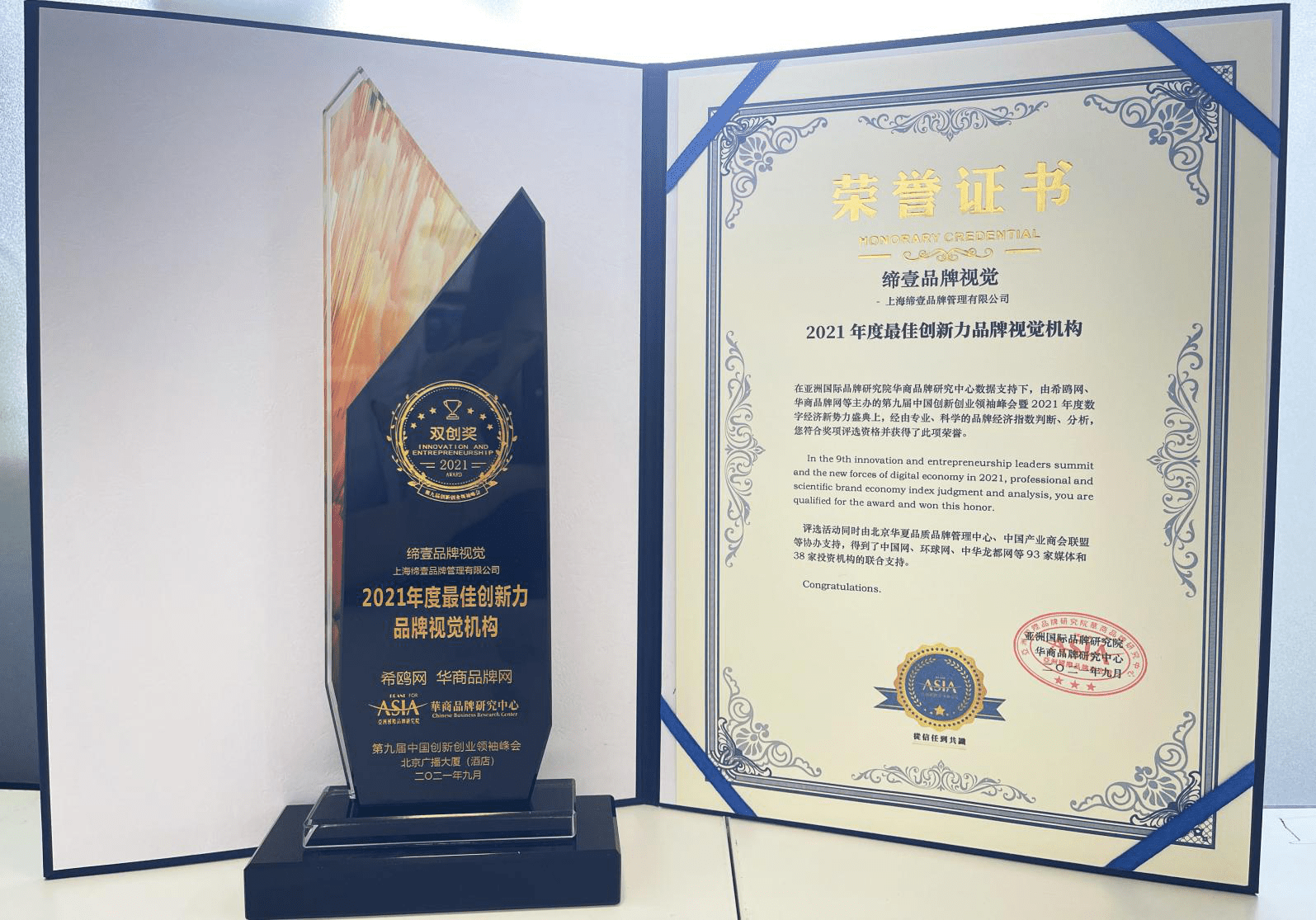 9月25日,由希鸥网联合聚通达、华商品牌网主办的第九届创新创业领袖峰会在北京广播大厦举办。【缔壹品牌视觉】凭借“品牌差异化的辩证捕捉,品牌竞争的深刻解析,核心是对品牌目标群视觉体验的专业追踪洞察”,并专注与客户一起研究品牌发展路径和目标群特征变化规律,经过验证沉淀,拥有了自创的“3X(新信心三基点)品牌NEW战略模型 ”和“8P(八力能量密度)视觉NEW效能模型”,并完成了与全球知名研究机构nienlsen尼尔森联合研创的—“5i(吾爱)品牌视觉NEW效能数据库”,以此为基础创建了一套完整的“强调CHINESE NEW STYLE的,着重顾客沟通和体验的”品牌新视觉体系。这让缔壹底蕴深厚,与众不同,在“品牌视觉”领域更是一骑绝尘,在此次盛典上荣获“2021度最佳创新力品牌视觉机构”大奖。