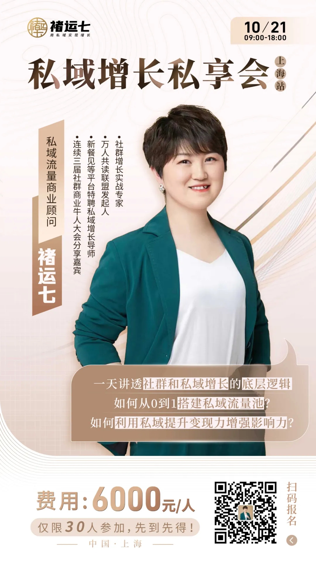 如果说,在2014年到2020年这六年多里,褚运七做的是蜕变出了一个私域运营实战专家褚运七,那么,从2021年这一年开始,褚运七做的就是用自己的专长,帮助更多的个人和企业,做到迭代对私域的认知和商业模式,为他们提供了可复制和易落地的解决方案。