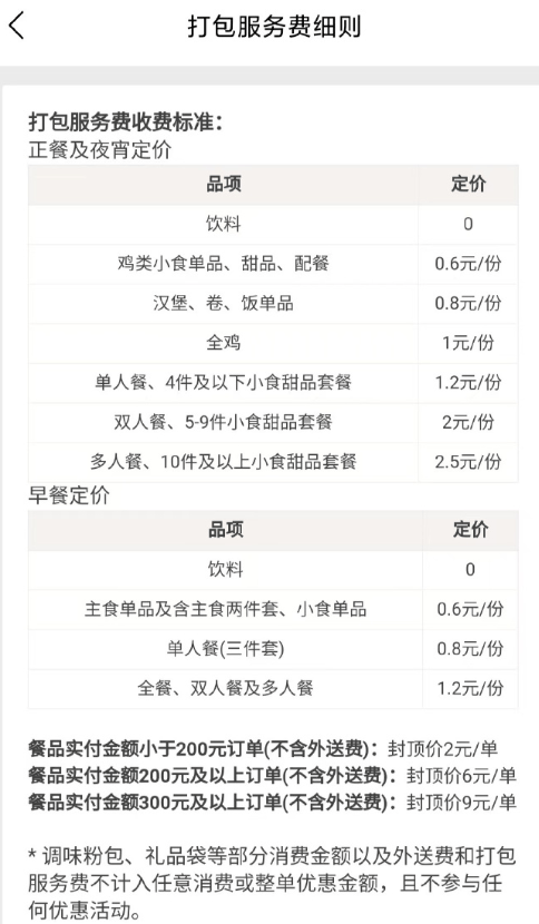 2月,肯德基宅急送宣布:外送费官方定价于2月20日从9元下调为6元。同时,对外送打包袋进行了保温升级、提供专人打包服务,并酌情收取打包服务费,打包费划分为三档,分别为2元、6元和9元。