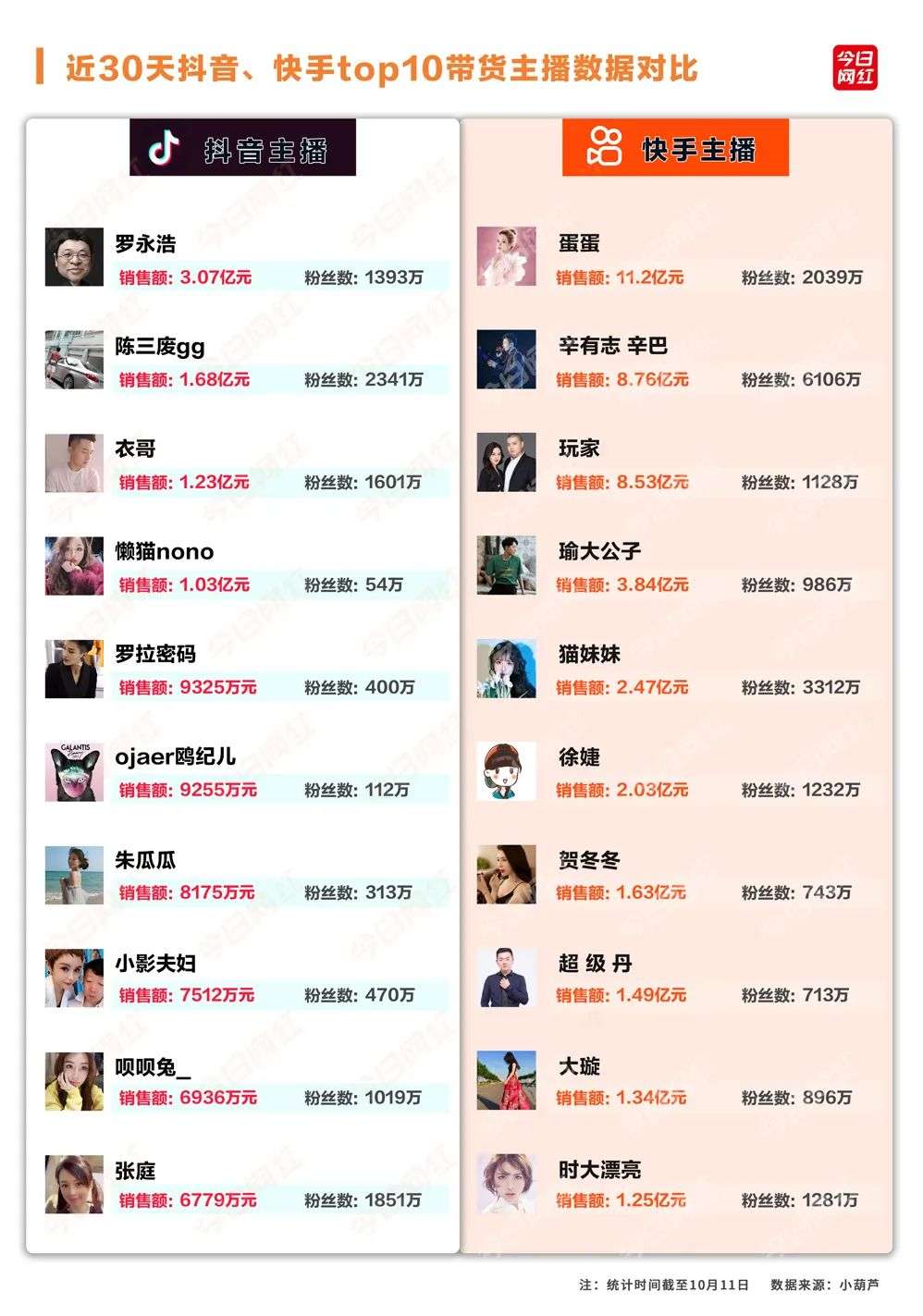 小红整理了抖音、快手两个平台,近30天里直播带货销售额前10名的主播数据,来看看两个平台的不同——