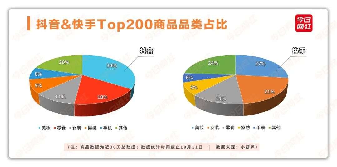 此外,快手抖音卖的货也不太相同,除了美妆都是大头外,快手卖女装更强,抖音卖零食更好。