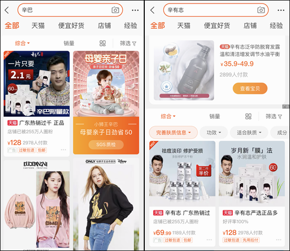 从产品上就可以看出,打开电商平台搜索辛巴,用“辛有志”、“辛巴”等关键词做标题、辛巴形象作封面的商品数量并不多,其中他自己供应链中的商品就占据了大半。