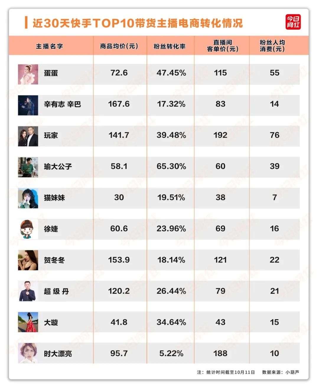 快手十位主播的平均粉丝转化率为29.7%,高于抖音的14.6%