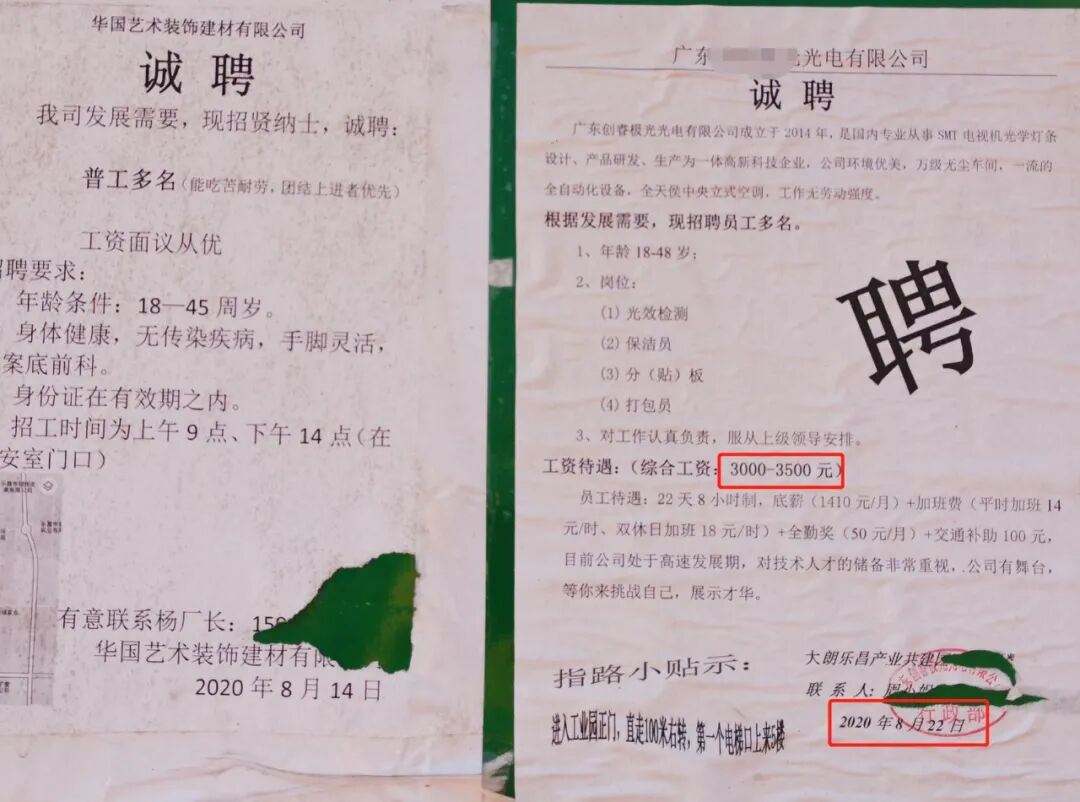 很多工厂门口放着招工广告,一个写着工资以计件为主3000-6000元。