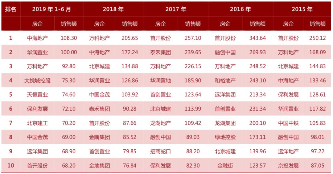 表:2015年-2019年上半年北京房企销售金额排名