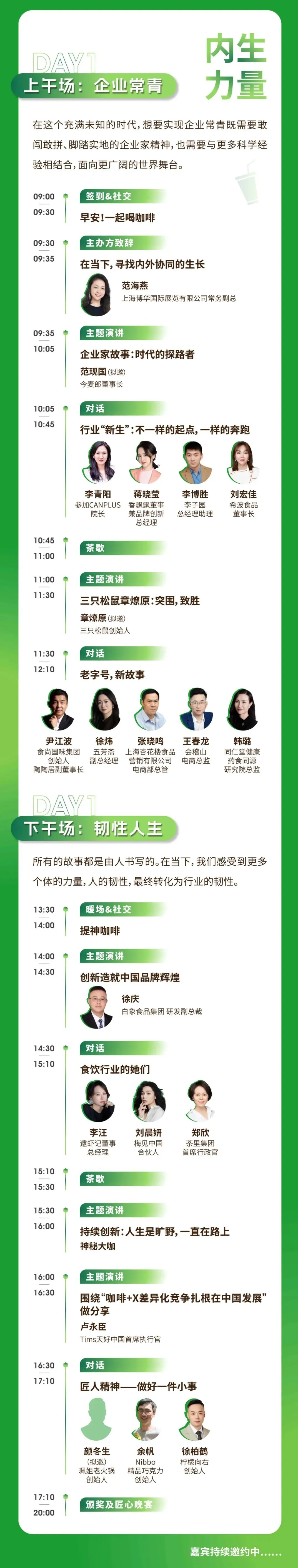 优秀的企业如何能够做到穿越周期的能力?保持常青的企业,各有各的秘诀。在时代的华章下,某些闪耀的时刻被历史篆刻,成为似乎不可复制的传奇。但随着时间的沉淀,我们依旧能够在他们的成长历程中,沉淀出商业底层的逻辑。大会现场,我们将邀约众多知名食饮企业创始人倾谈《企业家故事:时代的探路者》,以过来人的智慧,指点新一代人的开拓之路。