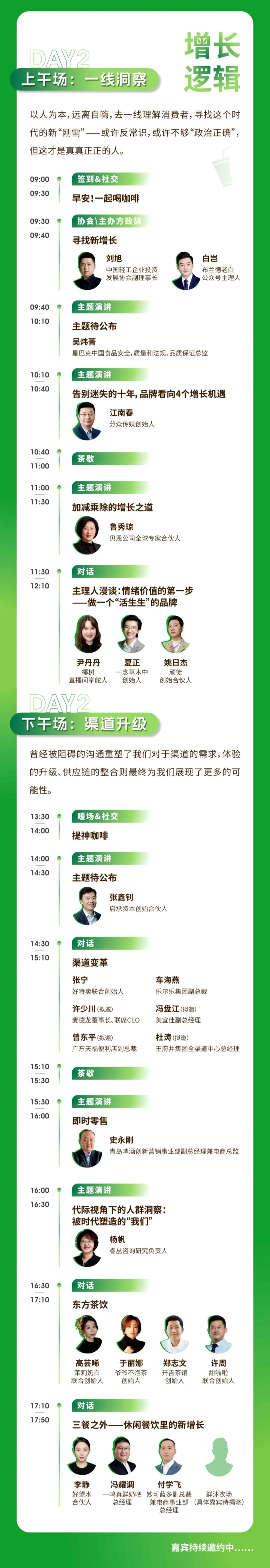 大会将用两天的时间,围绕“内生力量”和“增长逻辑”两大模块,以及“企业常青”、“韧性人生”、“一线洞察”和“渠道升级”四大主题,聚集50+特邀嘉宾及2000+食饮行业人一起,通过主题分享、圆桌讨论、榜单评选、新品发布、匠心晚宴和参会交流等形式,探讨在时代的大考中,我们这一代食饮人该如何解题,实现内外协同的生长。