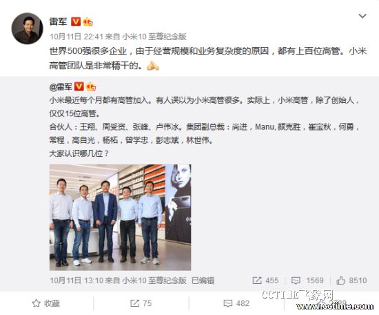 雷军在评论中表示,世界500强很多企业,由于经营规模和业务复杂度的原因,都有上百位高管。小米高管团队是非常精干的。