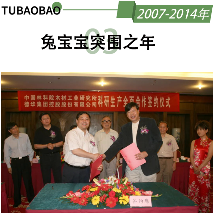 2007年,兔宝宝与中国林科院木材工业研究所签订产学研合作,使公司技术创新能力不断提升。