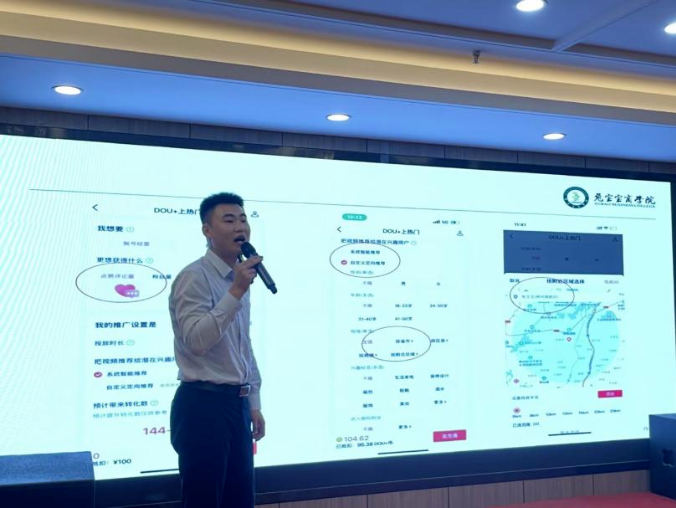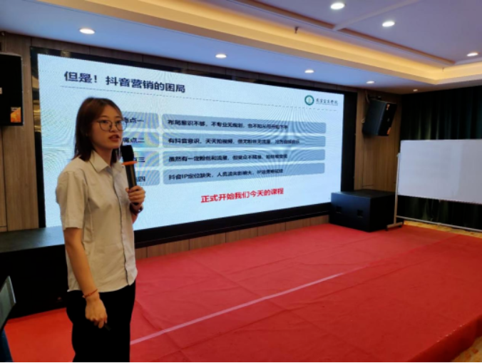 第一天的课程是由商学院讲师陈文静带来《账号定位和人设打造》,从分析抖音的底层逻辑开始,让学员们明确了自己账号的定位,打造属于自身的专属人设IP,并详细讲解了如何开通企业蓝V号及其功能。接下来是《短视频制作》课程,陈老师为大家讲解了短视频发布运营及投流机制,手把手教大家从剪辑开始,连着编辑脚本一气呵成,并且带入拍摄角度,带动学员为账号做涨粉大法,并在课后布置了短视频制作作业。