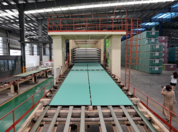 生产线包含了“上销下柱挤压出料立式成型自动控制系统”、“全自动横向进板运送系统”、“全自动定长切割码垛系统”等,可生产9mm,12mm,15mm等多种厚度和规格石膏板,板边平整,生产效率高,且确保质量和精度。截至目前兔宝宝已经成功研发标准型、360°除醛、加强型、耐水、耐火、耐潮、优家系列等十大系列石膏板产品,满足市场多样性需求。