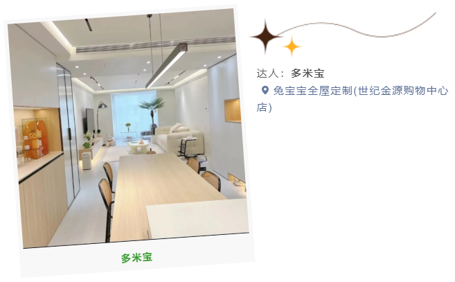 看完博主的探店日记,大家是不是对兔宝宝全屋定制心动啦?兔宝宝全屋定制除了有好的东西,还不用纠结尺寸、风格的匹配,自己中意的定制家具可以完美融入你喜欢的风格,使得整个家居风格统一,但又有自己的个性化印记。做到了真正意义上的省心省力省。所以大家放心选择兔宝宝全屋定制,只管看最后的效果就行啦!