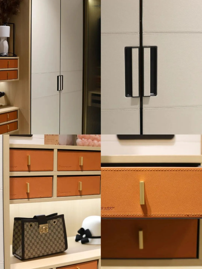 衣帽间超好看,原木风的配色,仿佛置身于森林中。一侧是铝框皮革的柜门,摸上去质感很高级,细节走线都很细致。另外一侧是玫瑰金长虹玻璃设计,能瞬间拉伸和扩大卧室空间视觉感。而且自带朦胧感,看着还挺有个性的哦。尺寸不一的抽屉和悬挂衣柜,让收纳更加多样、方便。
