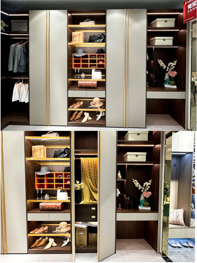 一门到顶设计,看起来很美观。柜门采用的是PET门板,柜体是深色萨托胡桃再搭配上浅灰色柜门,一整个高级住了~细节设计也做的很棒,置物架都是用五金做的,灯光下buling buling的。内置还有收纳盒,各种衣服都可以被合理收纳,美观又实用。