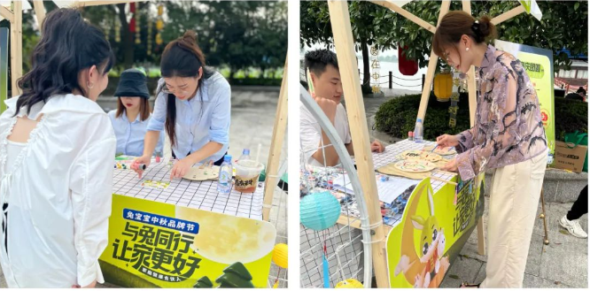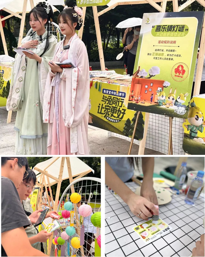 在中秋游园会现场,兔宝宝设置了5个打卡点,分别是与兔同行、家庭健康合伙人公约、喜乐猜灯谜、画扇庆团圆、投壶添好运,供游客参观、游玩。游园活动入口处的两处拍照打卡点因其造型时尚,就吸引了无数游客驻足留念。在这里,人们用手机记录下美好的回忆,同时感受兔宝宝的品牌理念。