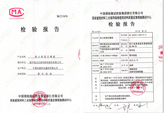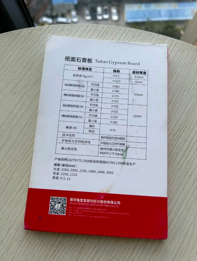 背面是石膏板的主要参数,这款的亮点:板材的遇火稳定性不小于20min,符合国家GB/T 9775标准。