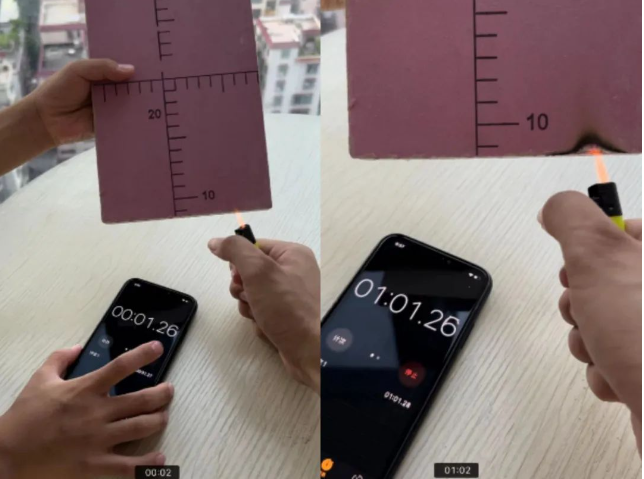 (1)拿打火机燃烧石膏板边缘,测试开始。