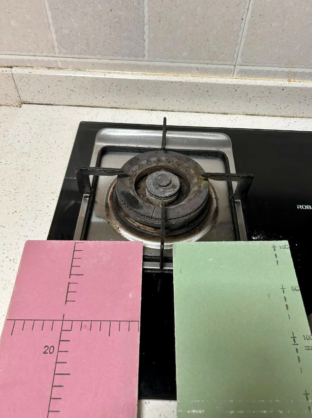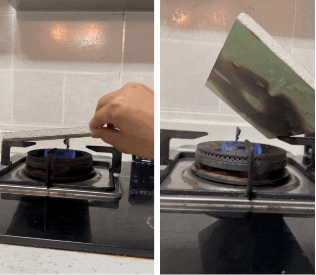 打开煤气炉,拧至焰心,放上普通的石膏板,计时开始。