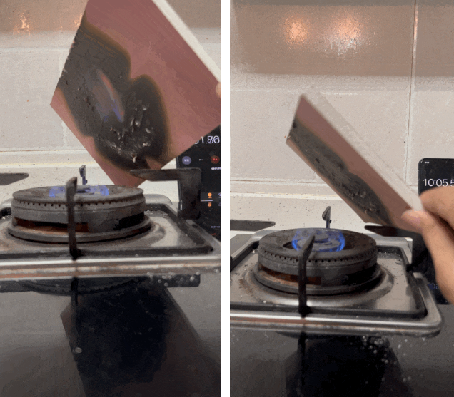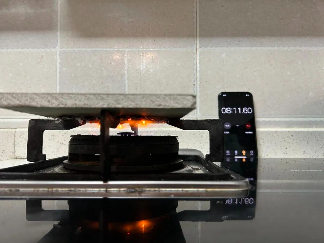 接下来用煤气炉明火进行测试,中间的焰心可达800-1000度。