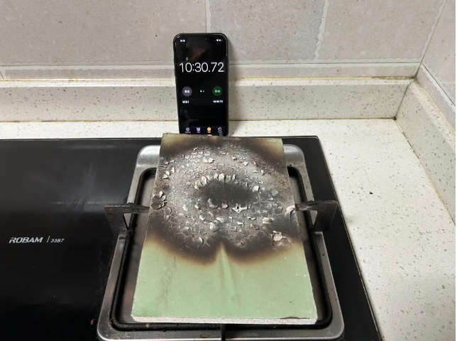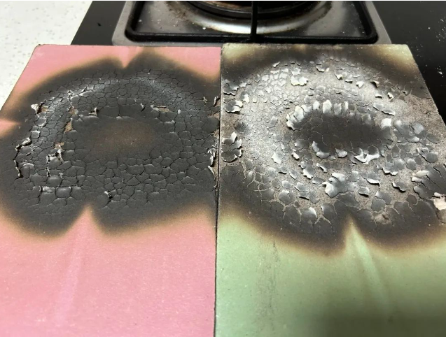 10分钟结束,最终燃烧结果如图,龟裂不是很严重。这是因为表面经过特殊防火处理,极大提高遇火稳定性。