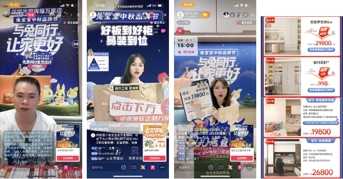 中秋品牌节活动期间,兔宝宝组织全国新零售三千多家门店进行了2000多场直播,共同为中秋品牌节赋能。通过直观、生动的展示方式,让消费者更直观地了解产品,为品牌与消费者建立了直接联系,提高了品牌知名度和美誉度。利用直播和博主探店来为终端门店打造新的流量入口,实现线上线下联动,也为本次活动宣传造势。为了回馈广大消费者,本次兔宝宝中秋品牌节还推出了多款优惠套餐。