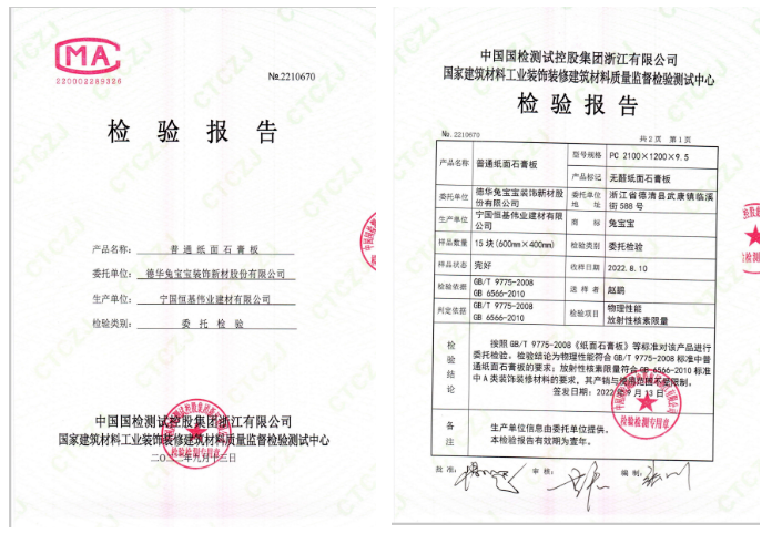 兔宝宝无醛纸面石膏板并且通过了中国国检MA测试,符合国家GB/T9775标准,产品质量有保障。