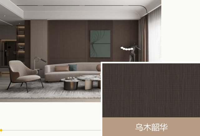 源于科技木纹理,肌理所体现出来基于交错线条形式的强烈触感,与细腻自然的直纹理各自独立,又相互和谐,多元而温和,形成柔和与强烈之间的平衡。体现了科技木的高级质感,适用于轻奢、自然的家居风格。