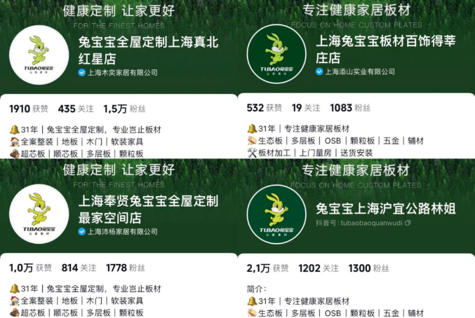 在树立品牌形象方面,将抖音头像、背景、名片均换为与兔宝宝品牌相关内容,让上海地区的兔宝宝经销商账号联合起来,在线上平台抢占流量声势。
