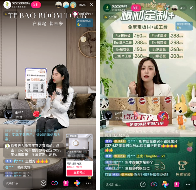 在年会当天,我们精心设置了三种不同的直播方式。第一种是,我们邀请了新零售优秀经销商做客兔宝宝直播间,分享账号运营的成功经验。奋斗创造历史,实干成就未来,他们用亲身经历激励大家继续努力,攻坚克难,在新的一年中勇创佳绩。我们还运用3D及2D技术为经销商展示了最新的直播场景、直播玩法、以及标准直播间设备搭建。与经销商面对面交流直播经验,手把手教学直播场景搭建,直观的向经销商展示不同技术对品牌宣传的助力。2023年兔宝宝新零售渠道建设卓有成效,为公司品牌传播与销量增长提供了有力支撑。未来,将继续以新零售模式来构建新优势、抢占新业态、形成新增长点从而推动新发展。