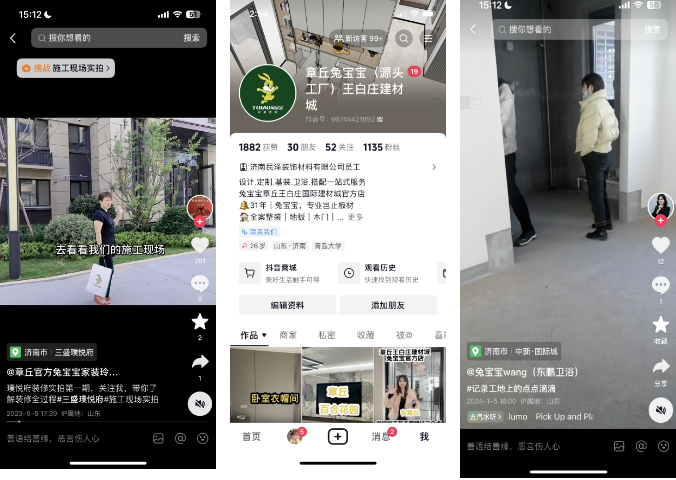 章丘国际建材城店分享“家装技巧”和“探房视频推荐”起家,凭借独特的见解和专业知识,迅速吸引了粉丝。随着个人账号的发展,门店意识到要更好地服务粉丝和拓展业务,需要建立一个矩阵账号体系,他们对门店的销售进行培训,上至有30年销售经验的老员工,下至有刚入职的设计师,都开始在抖音运营起自己的账号,门店后续通过不同的线上活动与客户建立了紧密的互动关系。同时,门店还组建了多个“家装社群”,让粉丝之间也能相互交流心得。