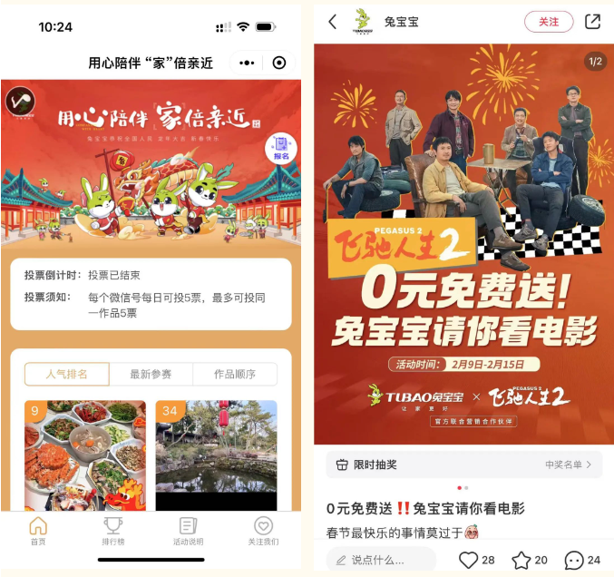 不仅线下宣传全面铺开,线上活动亦全面跟进。在春节期间,兔宝宝不仅发布了春节专属红包封面和一系列的春节海报,为了庆祝春节这个重要的传统节日,更是为了弘扬中华传统文化,传递节日祝福和品牌关怀。还在微信公众号、小红书、微博、一兜糖等多个自媒体平台发起了分享过年期间美好时刻的活动,并为观众提供专属的观影福利,吸引了超多人前来报名参加,让观众在观影的同时,感受到品牌的关爱和温暖。同时,兔宝宝还通过电影的影响力,向更多的人传递兔宝宝用心陪伴,家倍亲近的春节主张。