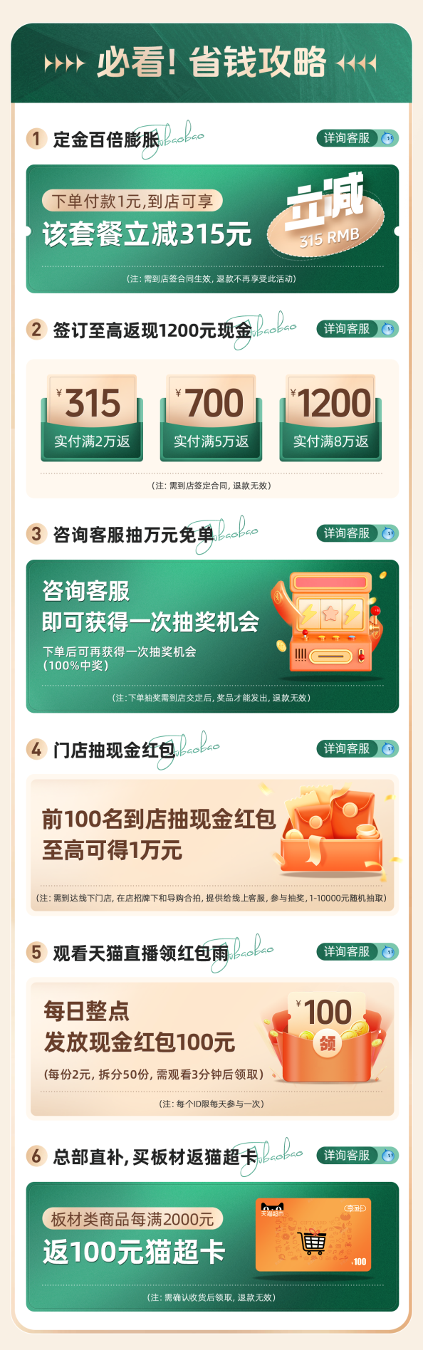 此次兔宝宝315品质家装节活动期间,推出了多款优惠套餐,有全屋定制套餐、板材、地板、木门套餐,供消费者选择。更有6大315特惠好礼,下单付款一元到店立减315元;签订至高返现1200元现金;咨询客服抽万元免单;门店抽现金红包;观看天猫直播领红包雨;买板材返猫超卡。更多惊喜等您揭晓!