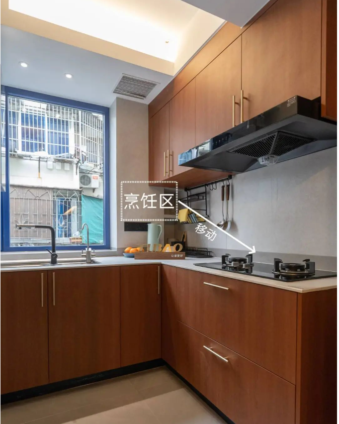 设计师重新规划动线,将烹饪区挪动位置后,备菜区瞬间变大,洗切炒一气呵成,动线合理。