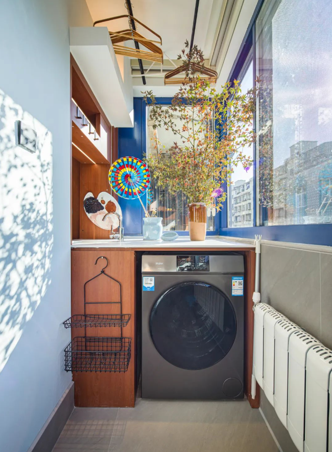 阳台以半开放的形式纳入室内,与卧室共用的墙设计成镂空形式,装上洗手池,改造为吧台。