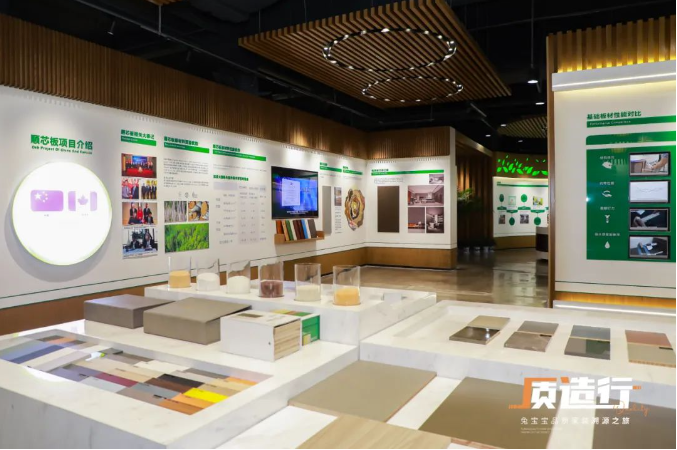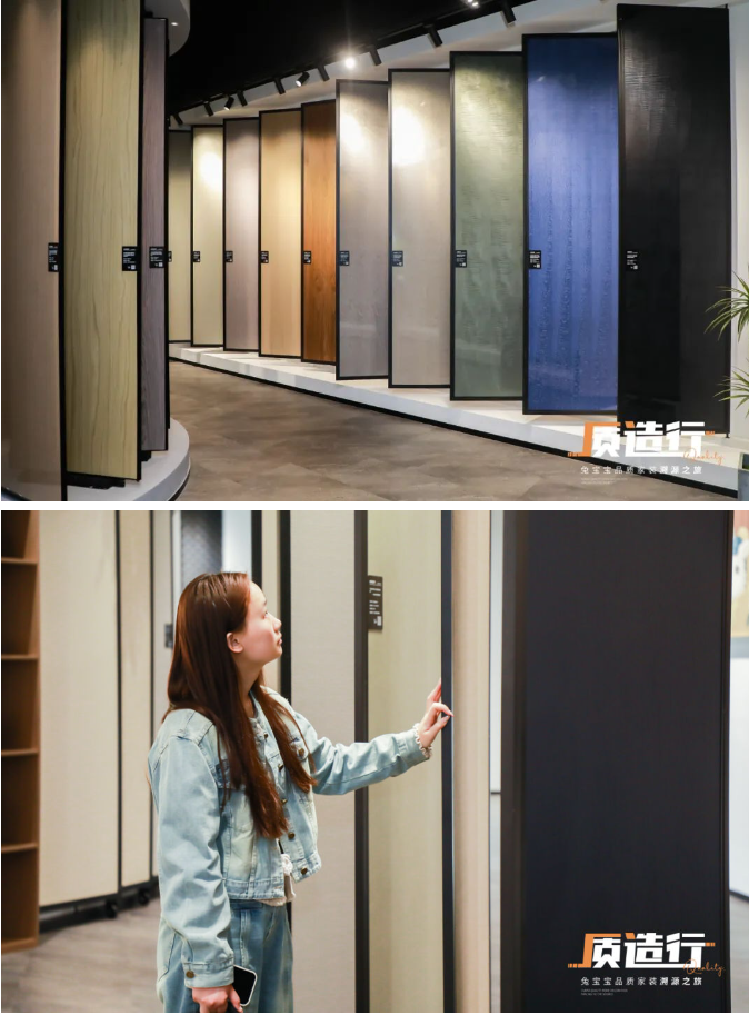 上述产品也是兔宝宝近年来研发的明星产品,在全产业链模式的护航下,兔宝宝将一部分重心转向更好的满足消费者的需求之上,兔宝宝家具板展厅,各种花色的板材陈列其中,这得力于兔宝宝每年在花色研发上的持续投入。讲到花色,我们不得不提的是“板纸一体化”技术,该技术更多地考虑了用户使用场景的丰富性,通过对自然万象的洞察和拆解,悉心设计了五大系列24款花色,将自然观感和肌理触感在纸面呈现,为家提供了更多组合的可能性及美学指导。