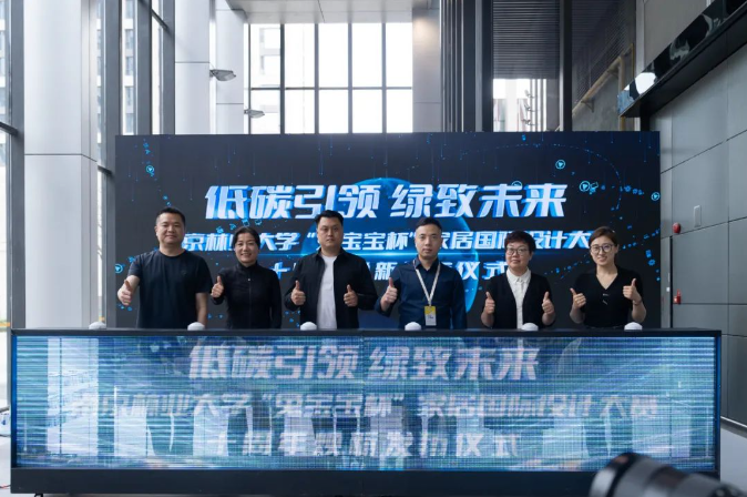 在全场二百余名观众的共同见证下,广东省定制家居协会副秘书长蒙辉、华南农业大学材能学院家具专业主任郭琼、广东生态工程职业学院艺术与设计学院产品教研室主任张佳琦、南京林业大学家居与工业设计学院教授陈于书、德华兔宝宝家居公司总经理沈怡强、杭州多赢网络科技有限公司总经理兼德华兔宝宝品牌建设中心总监冯越敏,共同按下了“南京林业大学‘兔宝宝杯’设计大赛十周年焕新发布仪式”的按钮,标志着大赛将持续与时俱进、革故鼎新,继续奔赴下一个十年。