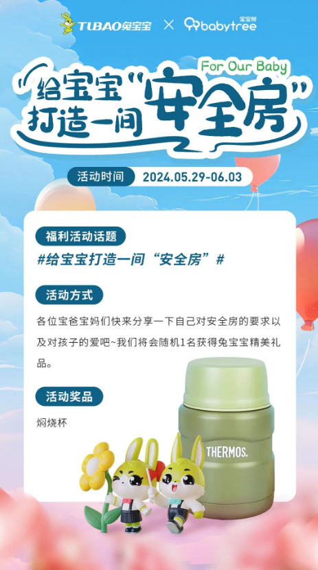 儿童是祖国的花朵,是家庭的希望。每一个孩子的健康成长,都牵动着每一位家长的心。在即将到来的“六一”儿童节之际,我们深感为孩子们提供一个安全、健康、快乐的成长环境的重要性。因此,兔宝宝携手宝宝树,共同为孩子们打造一间“安全房”,守护他们的成长环境。