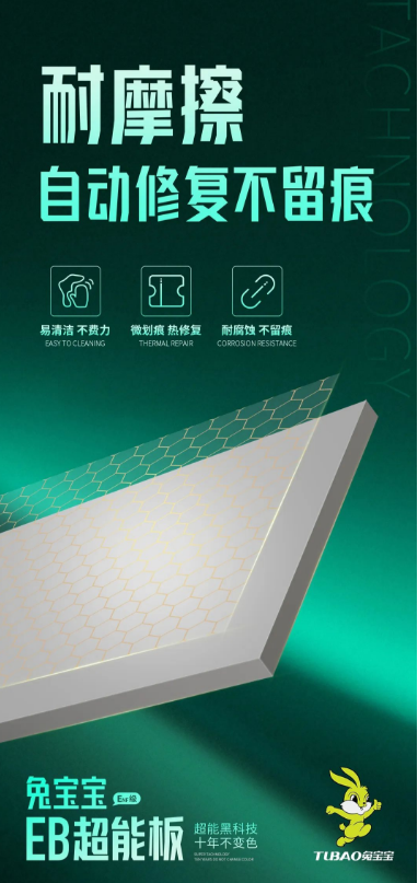 忙碌的生活节奏下,家居清洁成为了一项不小的挑战。兔宝宝EB超能板能有效防止指纹残留和污渍附着,让清洁工作变得轻松简单。只需轻轻一擦,即可恢复板材原有的亮丽光泽,再也不用担心孩子乱涂乱画了。