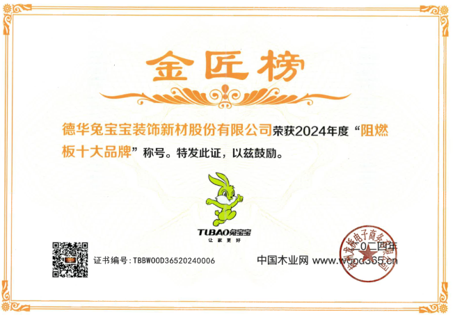 兔宝宝凭借其卓越的产品品质和对绿色环保的不懈追求,荣获2024年中国板材金匠榜“生态板十大品牌”“阻燃板十大品牌”两项荣誉称号。