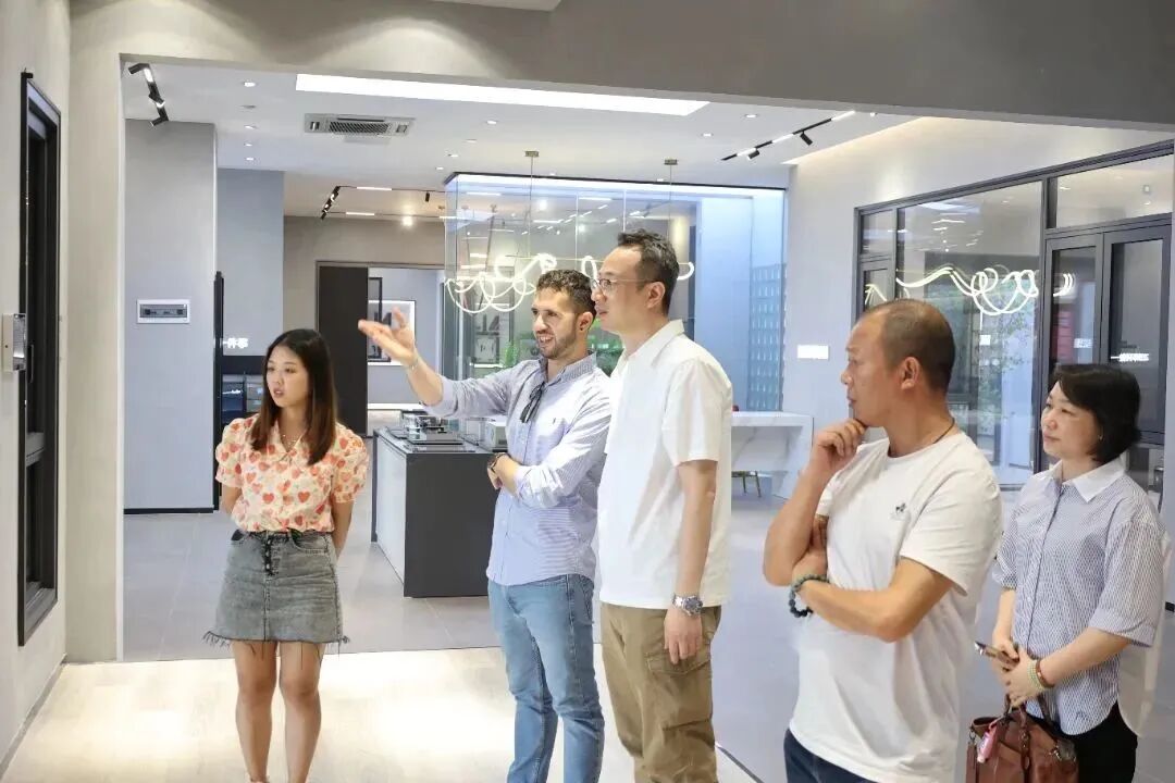 徐董及SIMONE先生一行首先到达美之选全新超大展厅进行实地参观,分别在电动智能提升窗、暴风雨测试系统、微通风系统、快装式阳光房、智能识别启闭系统等精美展品前就产品设计、结构、性能、功能等情况进行详细介绍。
