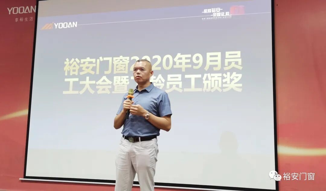 今天的大会,要为我们的老员工颁发工龄奖,老员工是公司的一笔财富,公司实现目标的过程,靠的是每位员工的共同努力,在裕安,我们的员工是有付出就有收获,我们感恩员工的付出,也希望员工能继续勠力同心,一起创造裕安门窗更美好的未来。