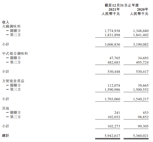 作为海底捞独家底料供应商——颐海国际(01579.HK)的大股东,刚刚退位的张勇持有颐海国际35.59%的股份。不熟悉颐海国际不要紧,如果你买过海底捞的周边调味料产品,那你就是颐海国际的消费者之一。根据历年财报显示,这家业务集中于火锅调味料、复合调味料和方便速食食品的公司,盈利主要来源于关联引收方:海底捞集团和蜀海供应链集团。受近两年来海底捞发展不利的影响,颐海国际在主要的三大收入板块都陷入停滞状态。