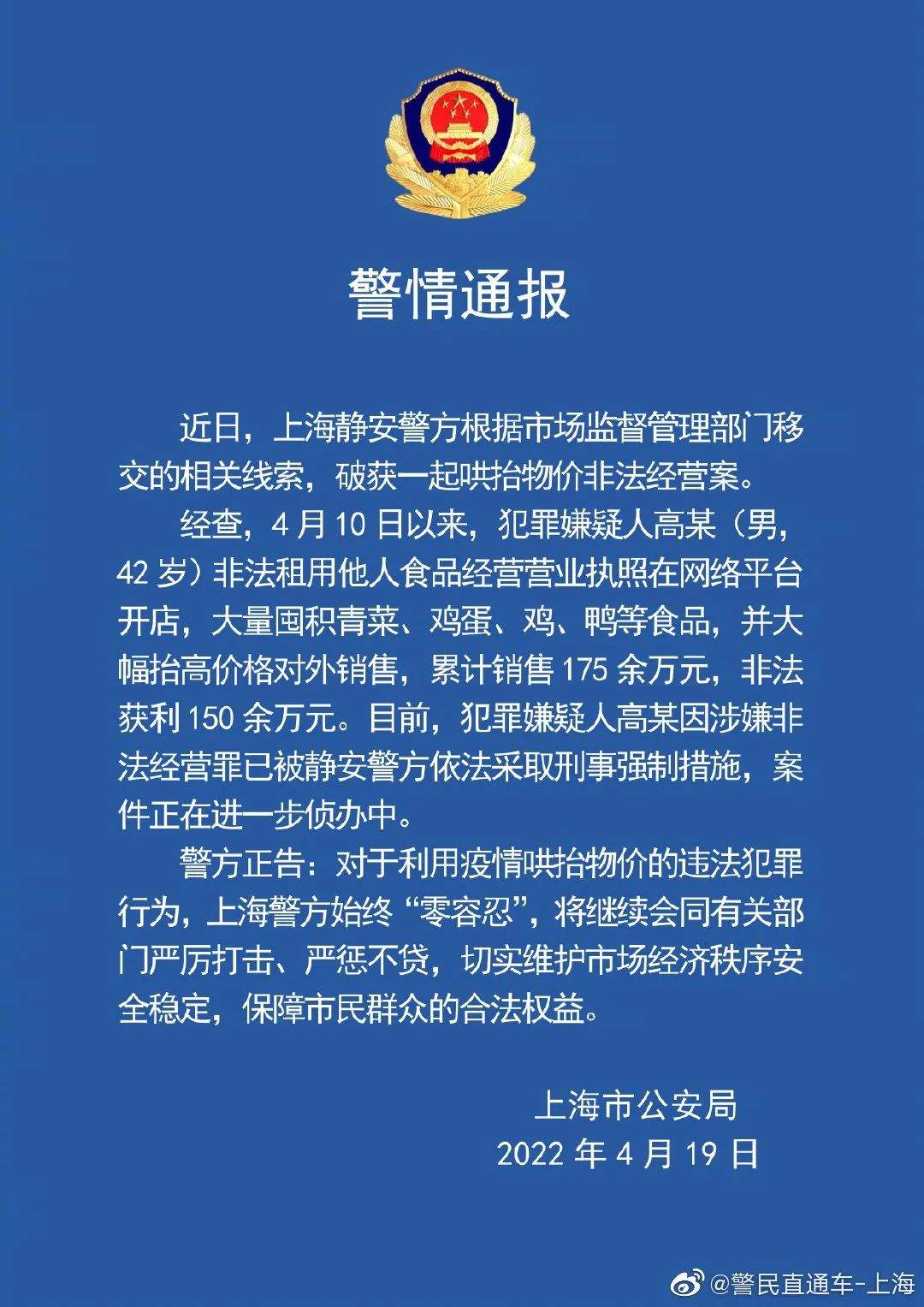 经查,4月10日以来,犯罪嫌疑人高某(男,42岁)非法租用他人食品经营营业执照在网络平台开店,大量囤积青菜、鸡蛋、鸡、鸭等食品,并大幅抬高价格对外销售,累计销售175余万元,非法获利150余万元。目前,犯罪嫌疑人高某因涉嫌非法经营罪已被静安警方依法采取刑事强制措施,案件正在进一步侦办中。