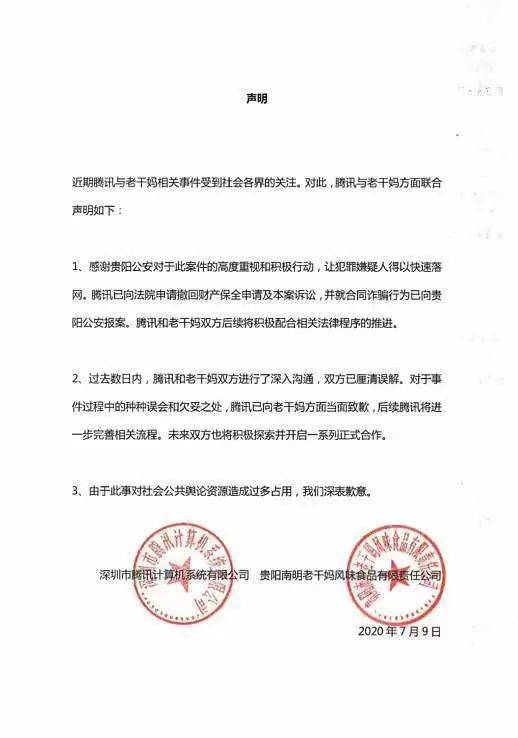 8天后,腾讯公司和老干妈公司发表联合声明称,腾讯公司已向法院申请撤回财产保全申请及本案诉讼,并已就合同诈骗行为向贵阳警方报案,腾讯公司和老干妈公司双方后续将积极配合相关法律程序的推进。此外,双方进行了深入沟通,已经厘清误解。对于事件过程中的种种误会和欠妥之处,腾讯公司已向老干妈公司方面当面致歉,未来将进一步完善相关流程。