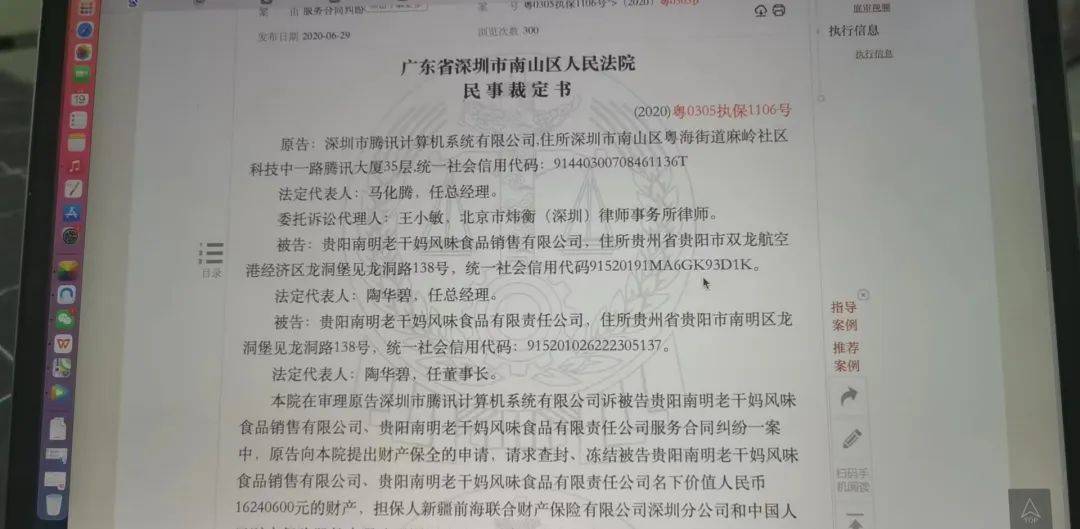 2020年6月29日,深圳南山区法院在裁判文书网公布腾讯公司起诉冻结老干妈公司1600万元财产,由此牵出诈骗案。