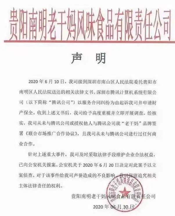同年6月30日晚间,微信公众号“老干妈”发布声明称,公司从未与腾讯公司或授权他人与腾讯公司就“老干妈”品牌签署《联合市场推广合作协议》,且从未与腾讯公司进行过任何商业合作。针对上述重大事件,老干妈公司及时采取法律手段维护企业合法权益,已向公安机关报案。