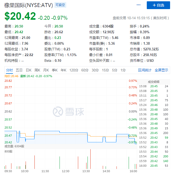 截至发稿,橡果国际股价为20.42美元,市值为5270.32万美元。上市13年,橡果国际算是中概股队伍里的"老前辈"。2007年5月3日,其在纽交所登陆时21.5美元的首日收盘价,以如今的股价对比来看不升反降。