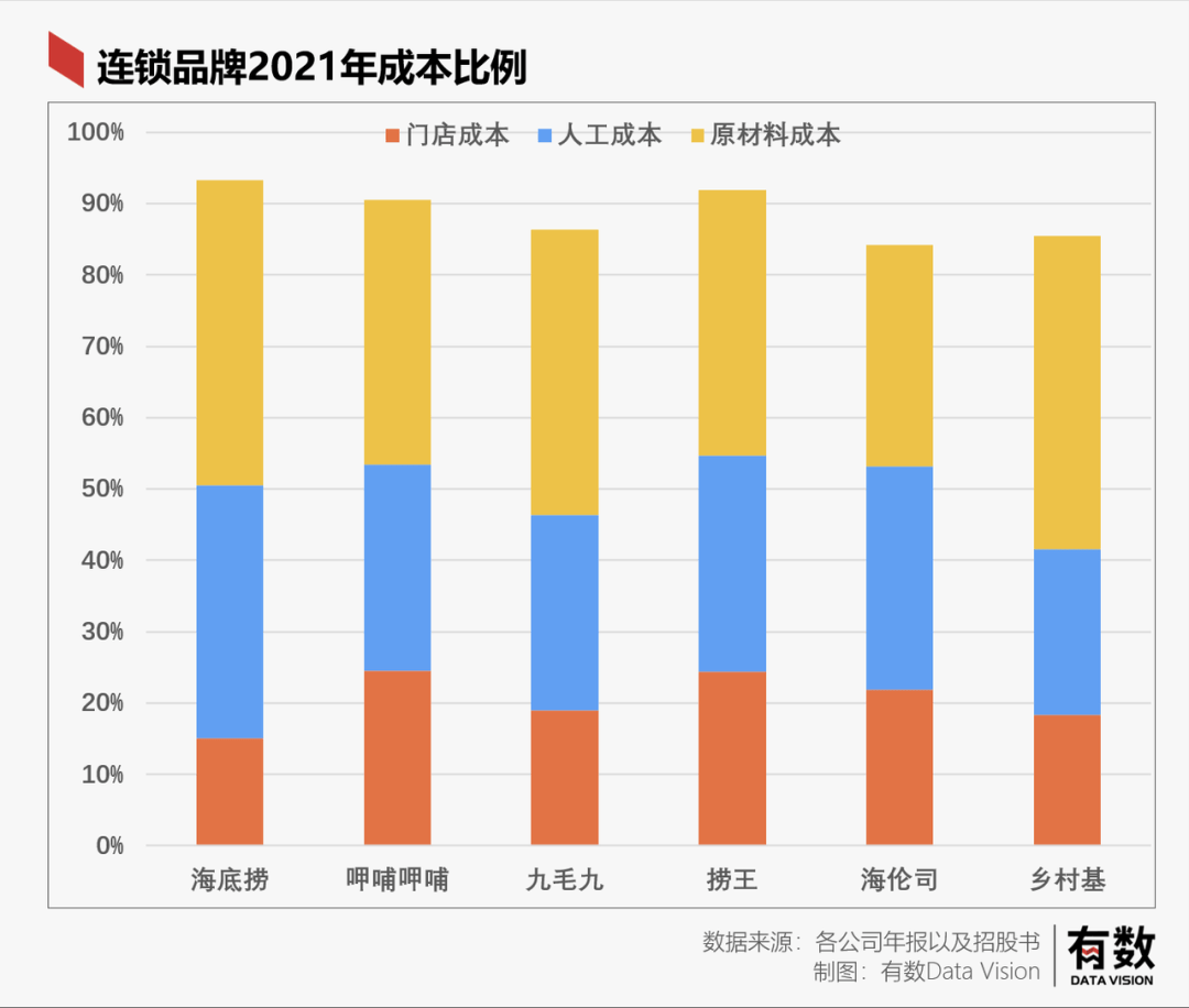 纵观大多数连锁餐饮品牌,房租、人工和原材料成本往往都占据总成本的90%左右。而且这部分成本有两个特点,一是刚性,即只要营业就会支出;二是无论品牌经营状况如何,这三块成本都会不断上涨。