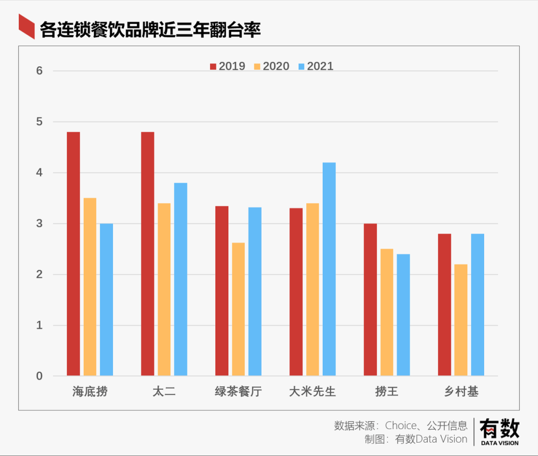 衡量餐饮业经营状况的核心指标是翻台率,这是一个可以把所有菜系、所有定价、所有类型的餐饮品牌都囊括进来的一个指标。而从各大品牌的年报来看,由于疫情的影响,几乎所有品牌的翻台率都没能恢复到疫情前的水平。